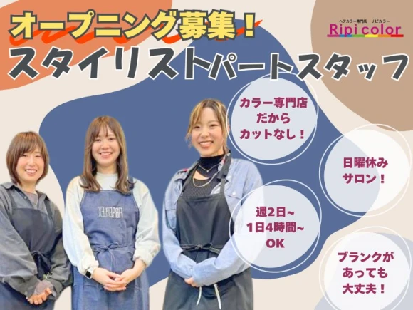 <2025年12月中旬頃新店舗OPEN!オープニングスタッフ大募集★>カラー業務専門のお仕事です!◇美容師免許があればOK◇週2~OK!◇日曜休みサロン◇経験が浅い方、ブランクが長い方も大歓迎!子育て中でも安心して働ける環境◇ヘアカラー専門店「リピカラー」にて一緒に働きませんか?━━━━━━━