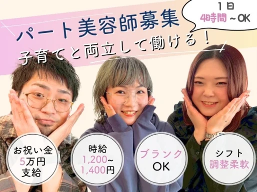 <ブランクのある美容師さん注目★★>全国200店舗展開のカット専門店でのパートスタイリスト募集◎【ママさん応援】法令に反するような長時間労働などもなく、自分を大切にしながら安心して働くことができる環境。美容師の仕事は好きだけど、手荒れや集客、ノルマなどが辛くて転職したい...そんな悩みを抱える方、一度ご相談ください^ ^