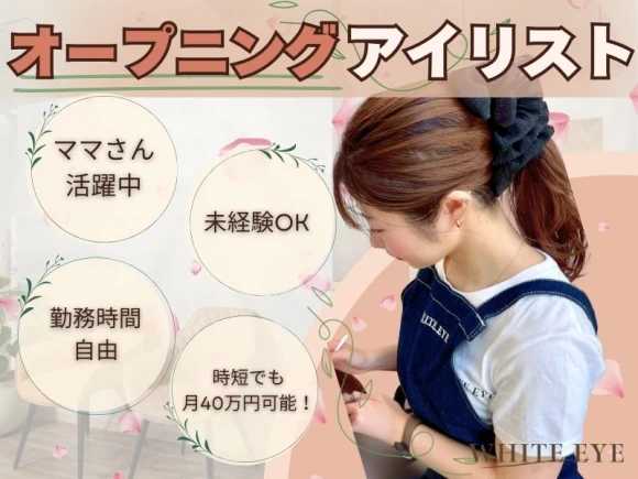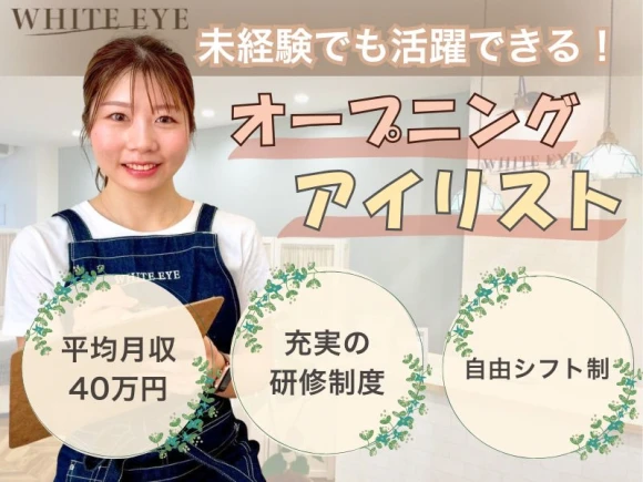 <<美容師免許があればアイリスト未経験でもOK>>2025年6月オープン!どこよりもアイリストに還元するWHITE EYEでアイリストデビューしませんか?◆オープニングスタッフ募集◆完全自由シフト制◆時短勤務OK◆ママさんスタッフ多数活躍中◆「スキマ時間での勤務OK!資格を活かして効率よく働ける環境です◎<会社について>